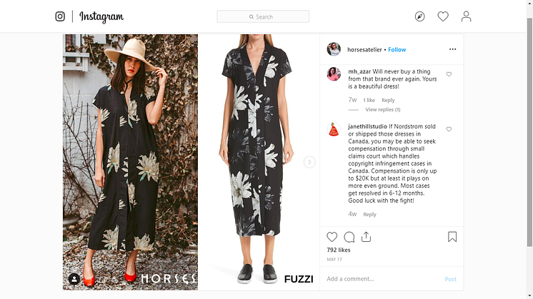 One of the commenters on Horses Atelier's post, Janet Hill Studio, said: "If Nordstrom sold or shipped those dresses in Canada, you may be able to seek compensation through small claims court which handles copyright infringement cases in Canada. Compensation is only up to $20K but at least it plays on more even ground. Most cases get resolved in 6-12 months. Good luck with the fight!"