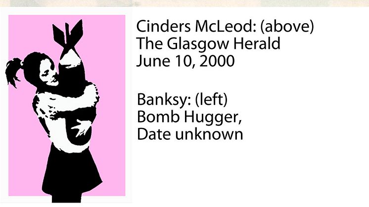 Cinders McLeod, a Canadian cartoonist, noticed similarities between Banksy’s works and some of her own when she attended an exhibit of Banksy’s works in Toronto earlier this year. She was surprised by how many of the exhibits reminded her of her own work.