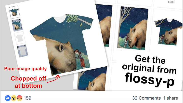 The artist found out that the picture of the giant wombat she drew were printed in poor quality on art prints and t-shirts, and were being sold at higher prices and advertised with promotional photographs taken from her Flossy P Facebook page.