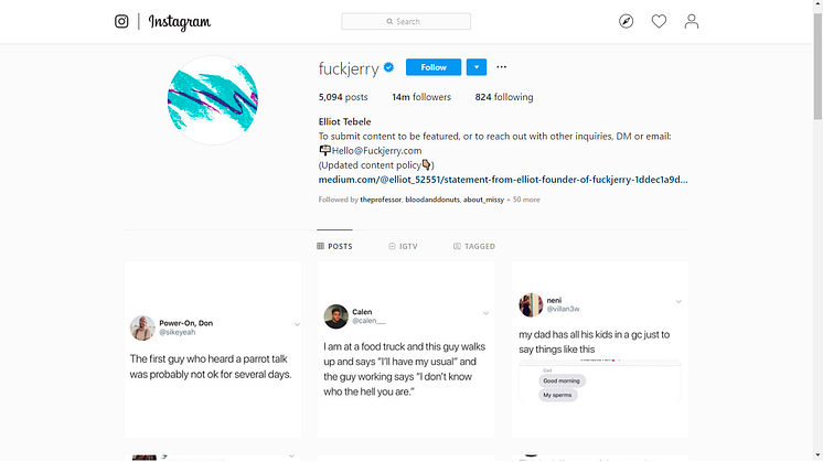 F**kJerry, an Instagram account created by Elliot Tebele in 2011, is a meme aggregator, which means it reposts memes and jokes and does not create original content. But it uses other people's content to make money by charging brands as much as US$30,000 to sponsor its posts.