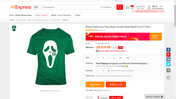 If Rozier loses the case he would have to pay over US$150,000, which would wipe out the earnings from his shirts. In the meantime, we wonder if Rozier knows about a ripoff of his design on a T-shirt being sold on AliExpress, an e-commerce website in China. Now, that would incur the wrath of both Rozier and Fun World.