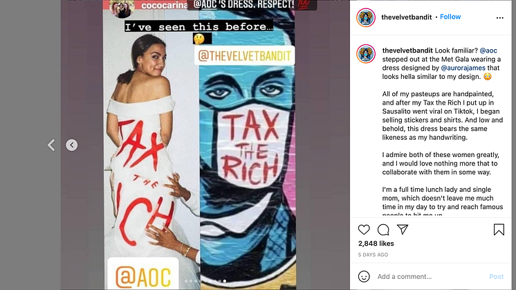 That said, since there is a clear timeline of documentation on social media, there is a good chance of The Velvet Bandit at least winning her case in the court of public opinion. After all, it’s not exactly a good look for Ocasio-Cortez to be championing the rights of the working class when she is using the work of a blue-collar artist without permission and credit, intentionally or otherwise.